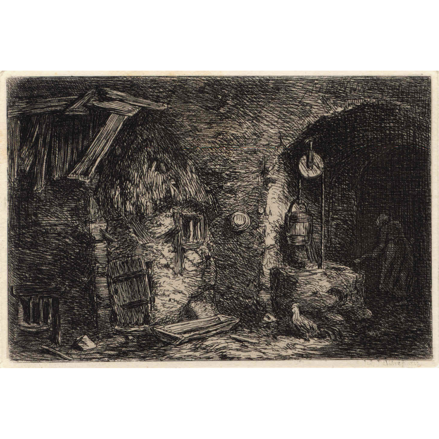 Fleeing the Cholera epidemics that besieged Paris in the mid-nineteenth century, Charles Jacque relocated to Barbizon in 1849 with Millet. There, he painted rustic or pastoral subject matter: shepherds, flocks of sheep, pigs, and scenes of farm life. In addition to painting, Jacque was also famous for his etchings and engravings. He, along with Félix Bracquemond and Felix Buhot, is credited with the nineteenth-century revival of seventeenth-century techniques. He began his career as an engraver around 1841 by publishing a series of etchings with Louis Marvy. He followed this work with a series of engravings based on the works of Adriaen van Ostade, after which he began to create original engravings / artworks. Charles Baudelaire said of him, "Mr. Jacque’s new reputation will continue to grow always, we hope. His etchings are very bold and his subject matter is well conceived. All that Mr. Jacque does on copper is filled with a freedom and a frankness which reminds one of the Old Masters."