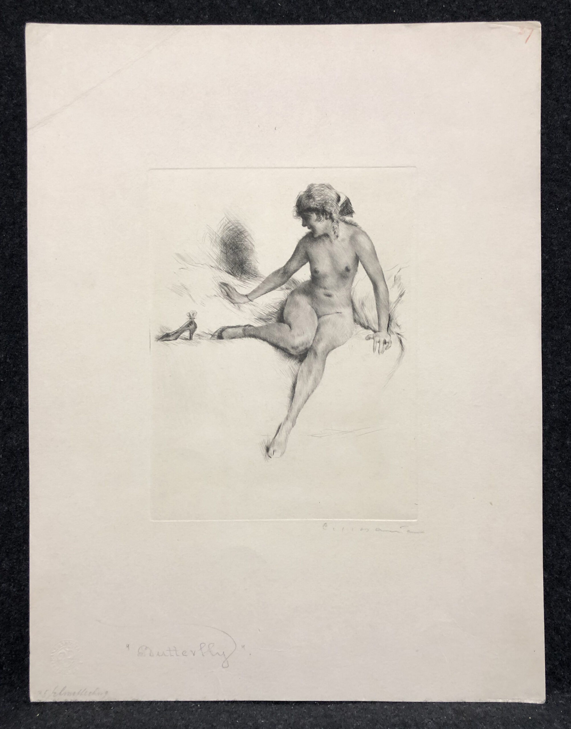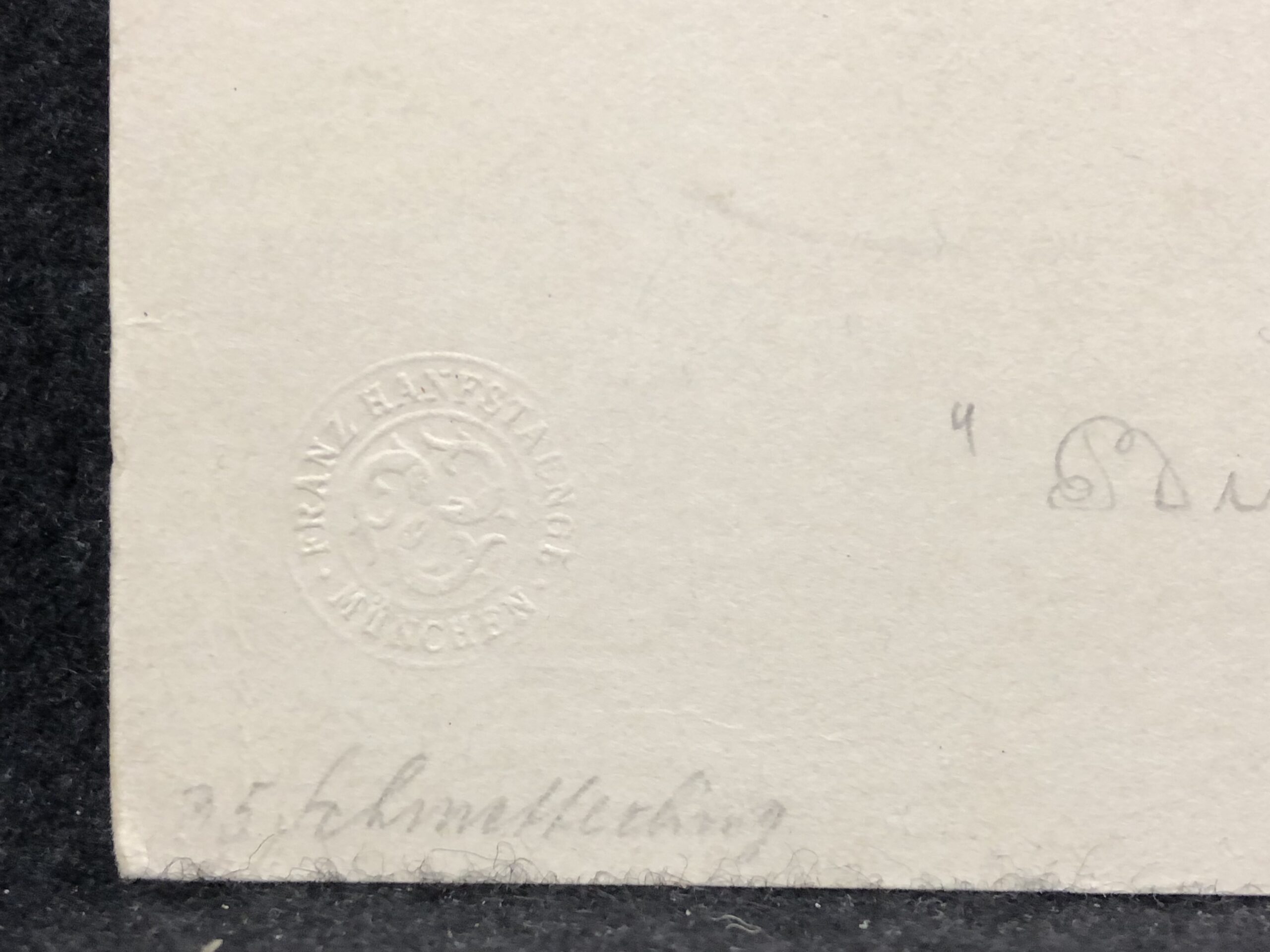 Drypoint, signed in pencil, printed in black ink on fine-grained, cream wove paper. Published by Franz Hanfstaengl Printing House, Munich, with their blindstamp at lower left corner. Fine condition, save for a creased corner, upper left. Free shipping to US address.