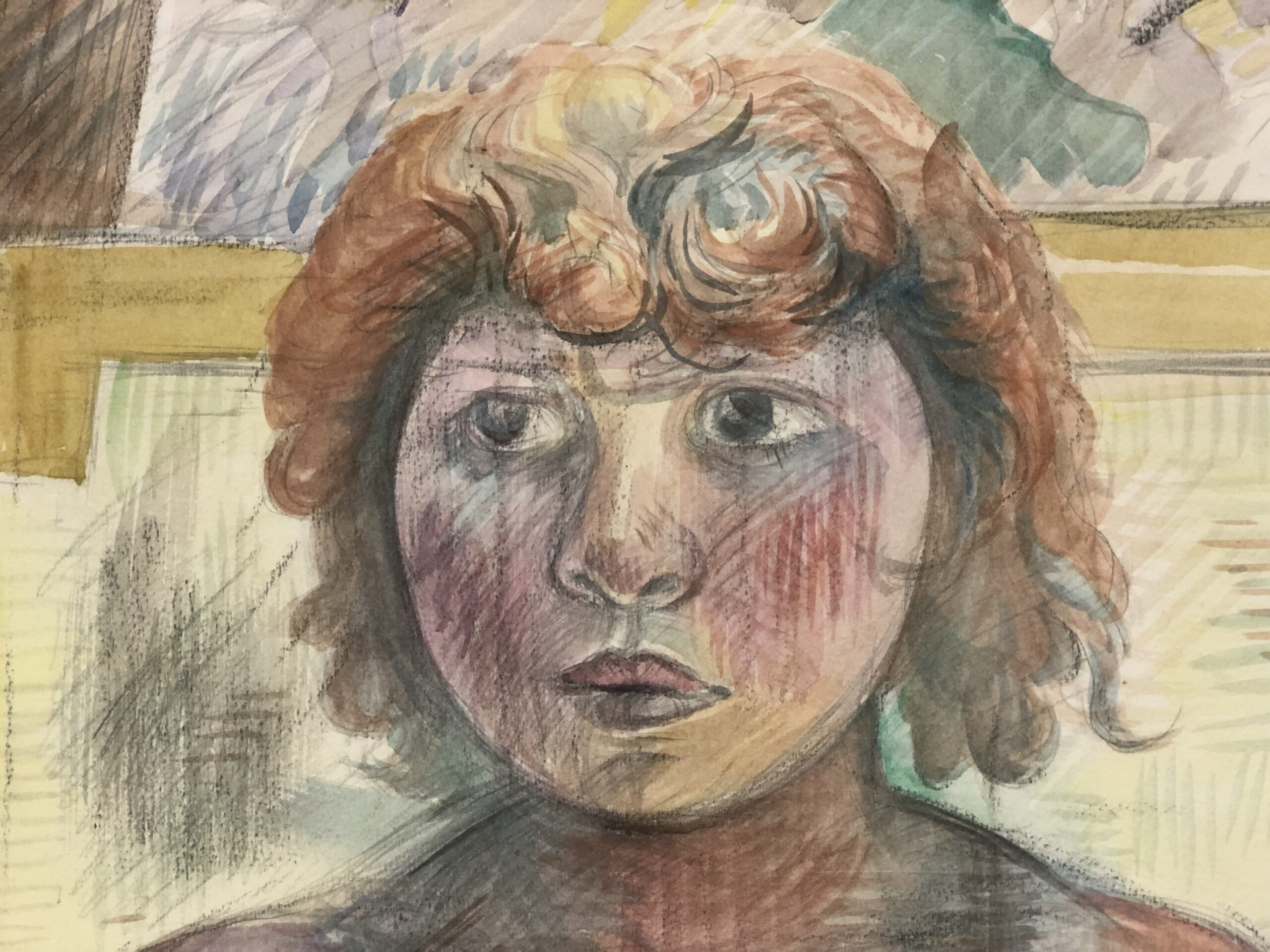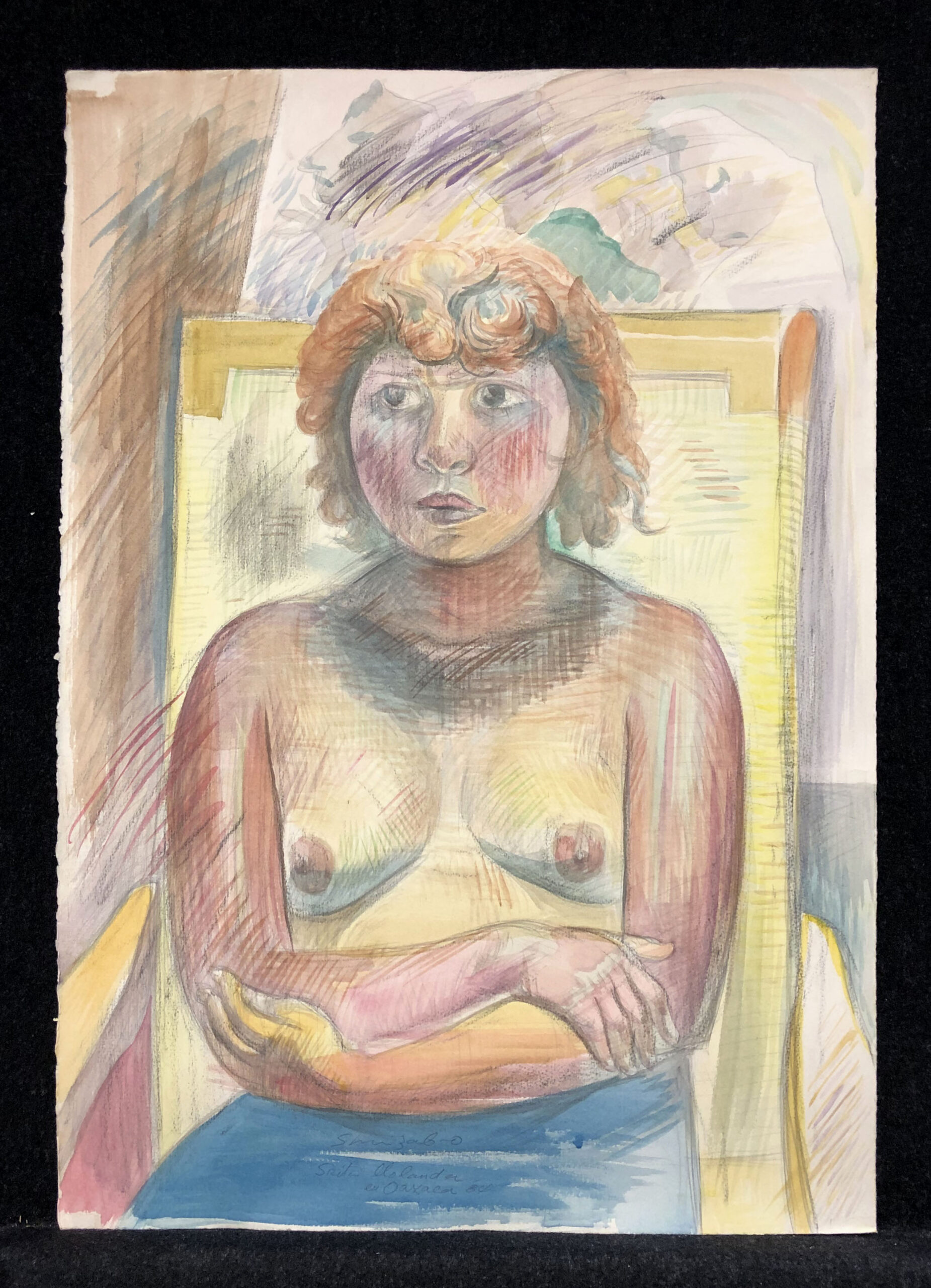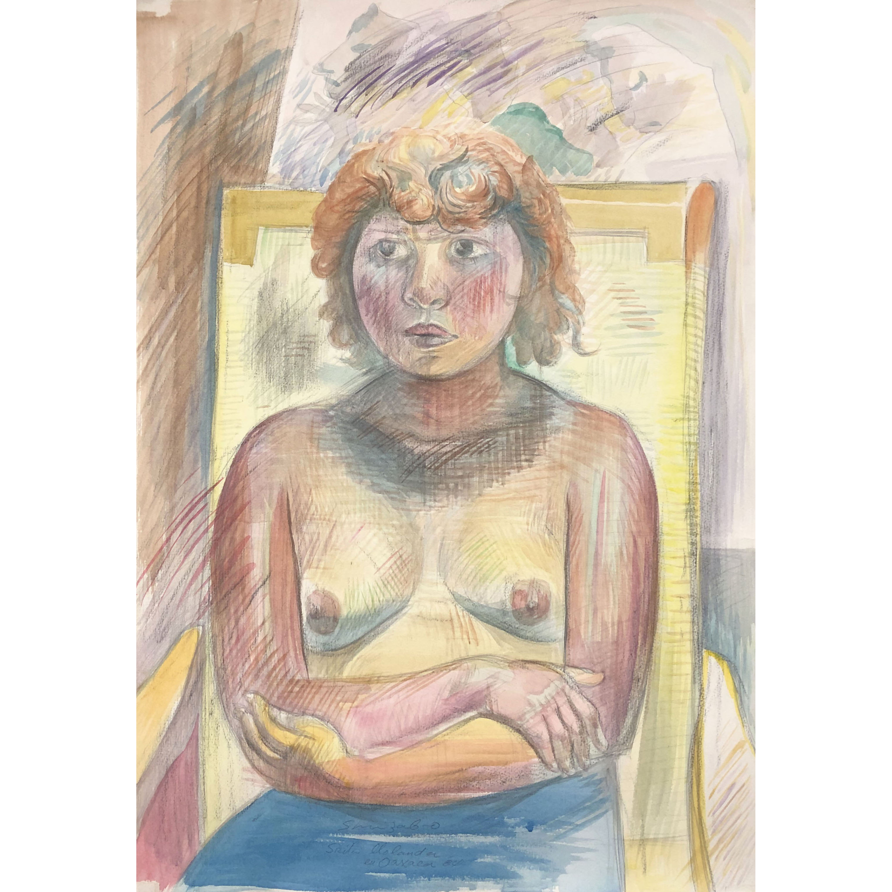 Watercolors and colored pencils, signed, dated in pencil and annotated ” Srita. Yolanda / en Oaxaca 84″ at lower center, executed on heavy, felt-finish, cream wove Arches paper, without margins.
