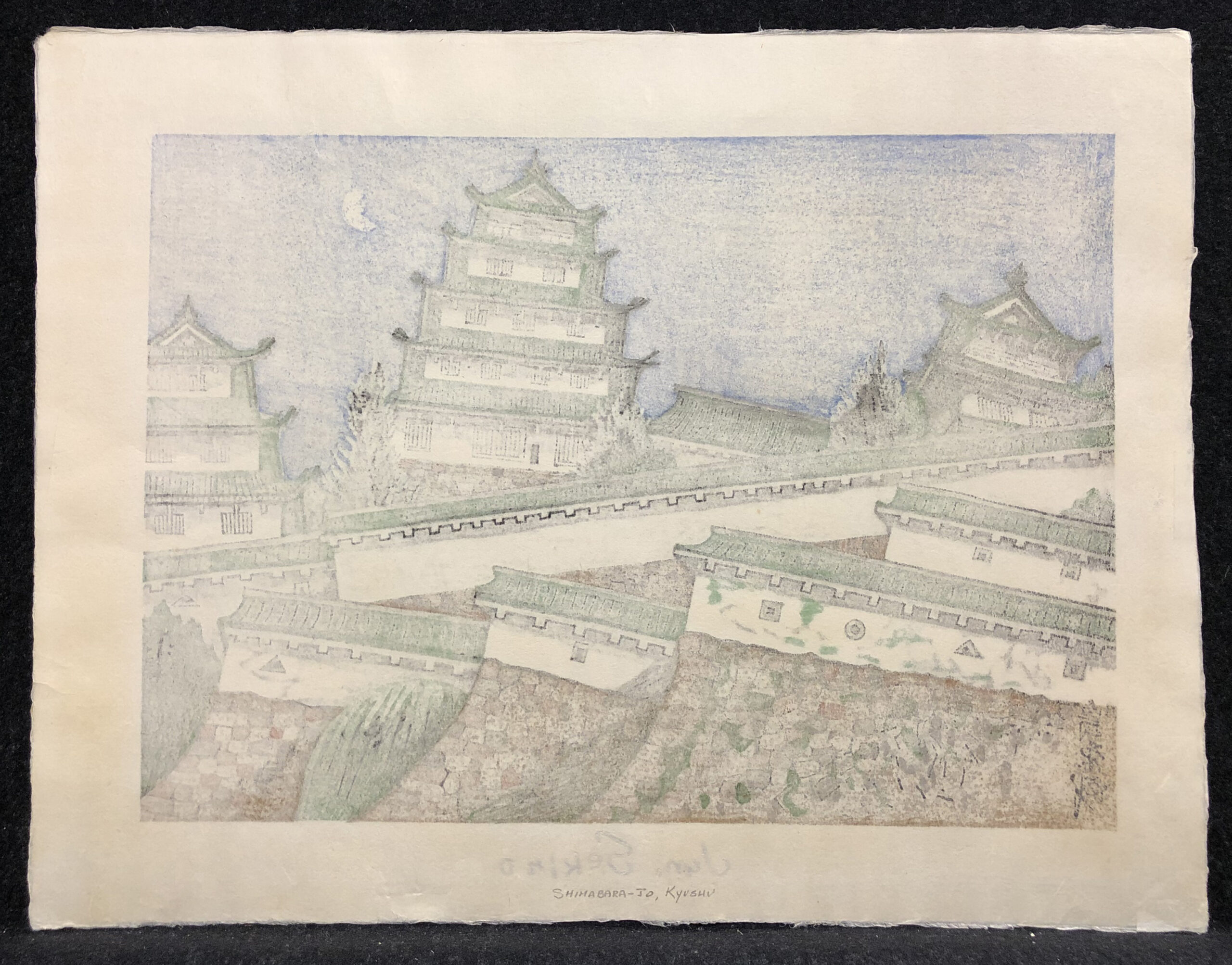 In 1935 the artist Okada Saburosuke (1869-1939) and the etcher Nishida Takeo praised Sekino’s etchings during a visit to Aomori and suggested that he enter the government sponsored Teiten exhibition. Sekino submitted an etching of Aomori harbor and won a first prize. In October 1935 he also won a prize for a woodblock at the fourth exhibition of Nihon Hanga Kyokai (Japanese Print Association). In 1938 he became a member of Nihon Hanga Kyokai (Japan Print Association) and in 1940, after moving to Tokyo, of Kokugakai (National Picture Association).