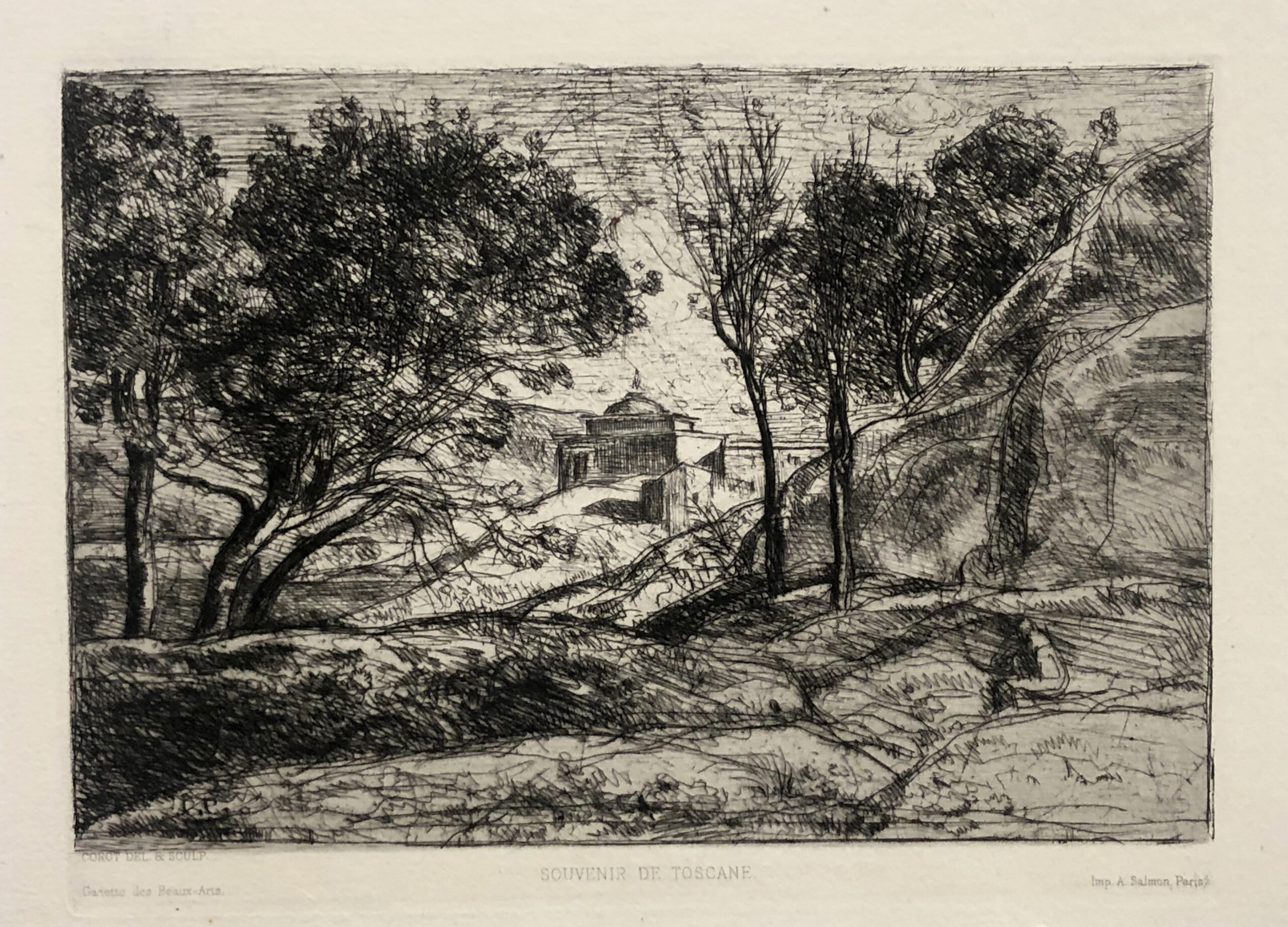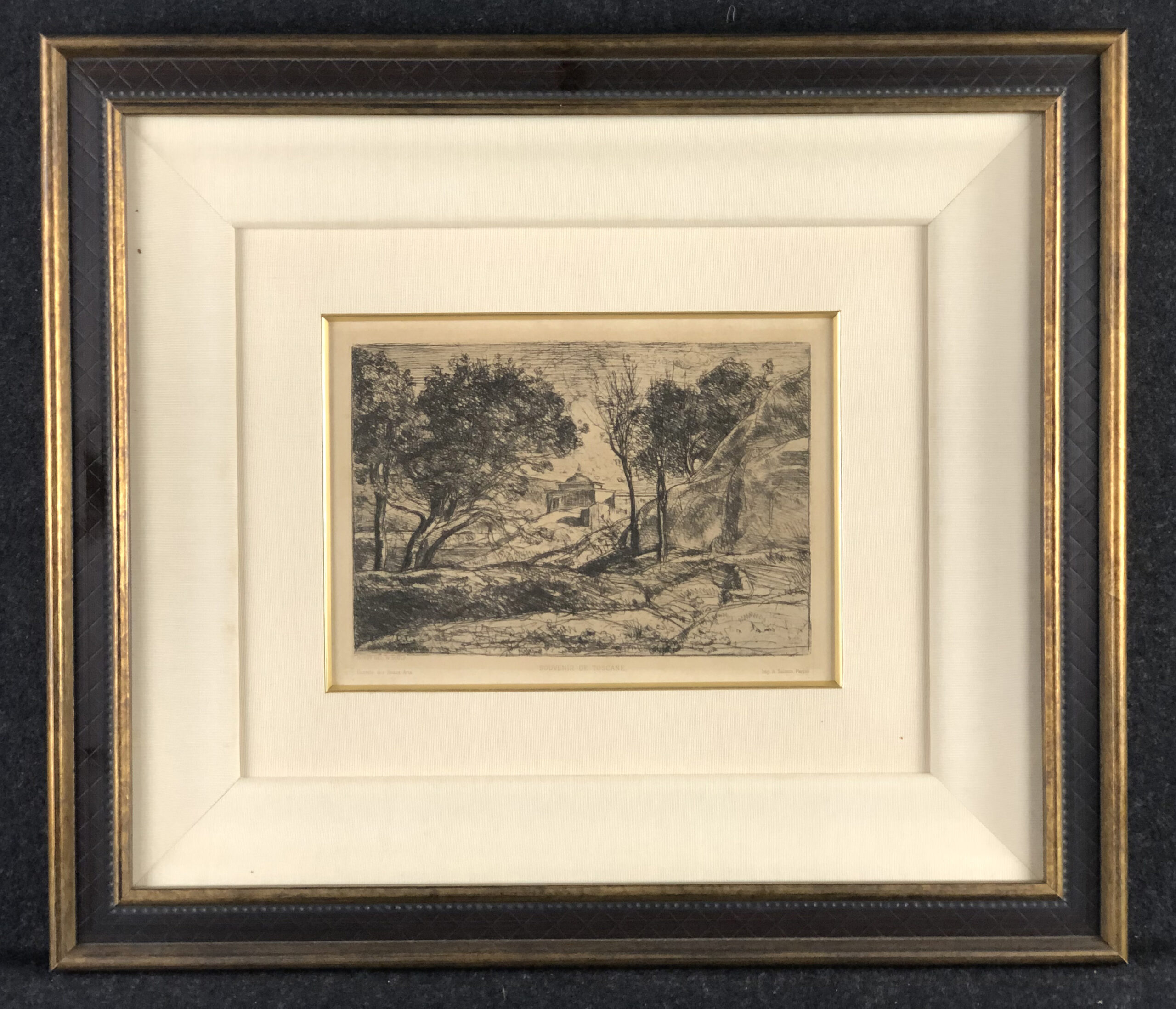 NotesAn extraordinarily innovative printmaker who mastered a variety of graphic media (etching, lithography, and cliché-verre or glass printing), Jean-Baptiste Camille Corot (1796 - 1875) broke away from the dominant neo-classical and romantic traditions of the period, evolving toward a more naturalistic approach, while retaining a certain reserved, yet lyrical verve. As the guiding force behind the Barbizon School beginning in the 1830s, and a noteworthy precursor of impressionism, he pioneered the idea of working out-of-doors, rendering atmosphere, while his youthful travels across Italy (between 1825 and 1828, again in 1834, and a third visit in 1843) gave him a taste for airy light as well as poetic effect: his freely handled landscapes, ever enlivened with tiny figures, almost seem to breathe.