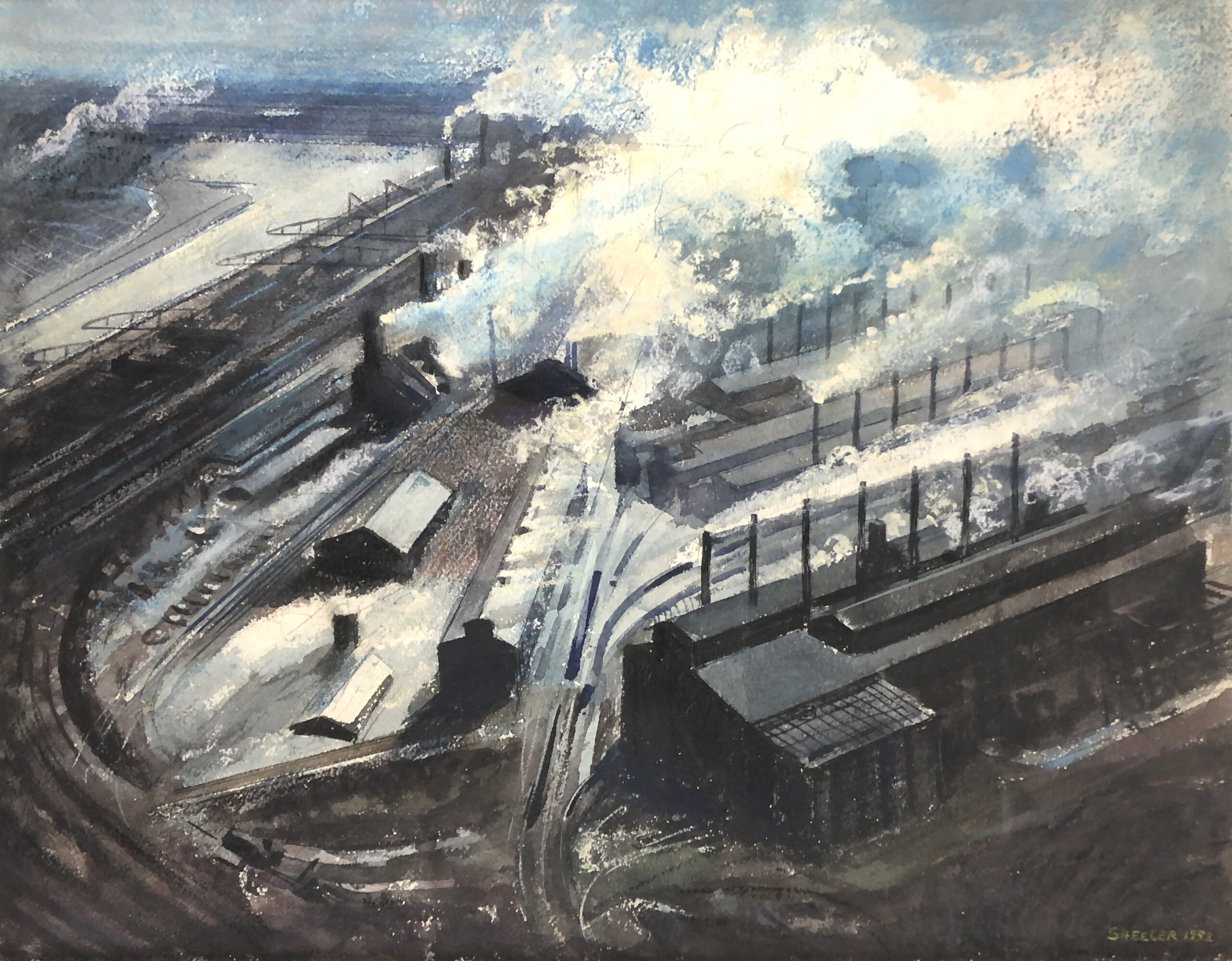 Watercolor over graphite of the Steelton Steel Mills in Steelton, PA, signed “SHEELER – 1952” lower right.