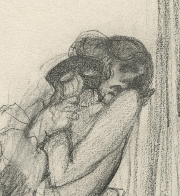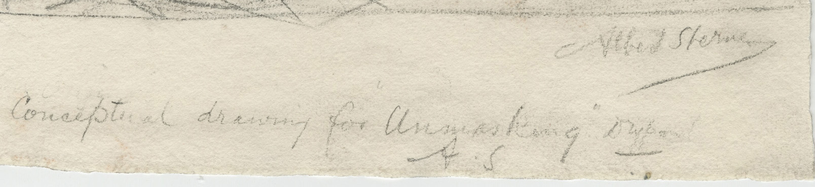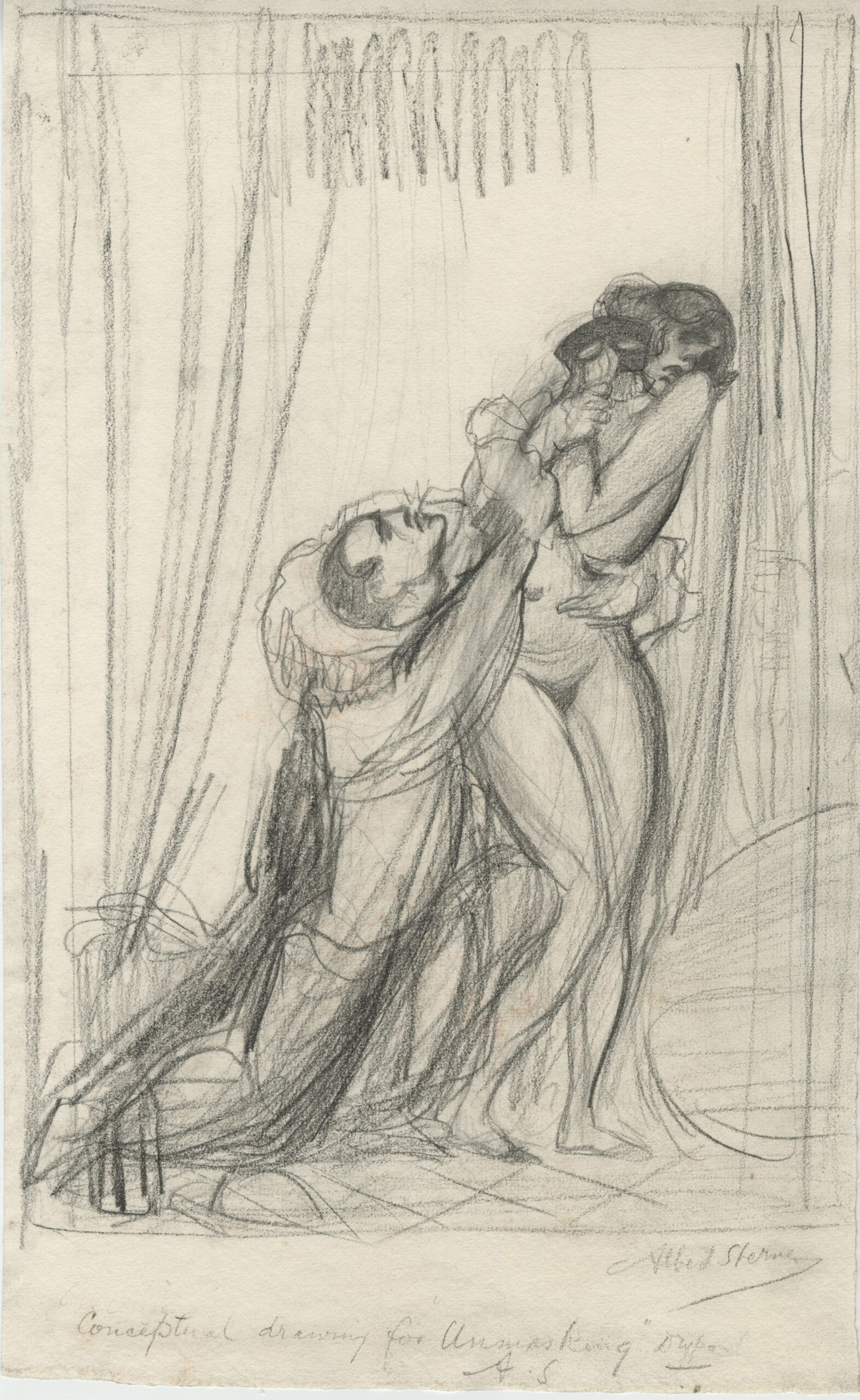 Graphite on paper, study for the drypoint The Unmasking, 1919. Signed in pencil and annotated “Conceptual drawing for Unmasking drypoint / A.S.” in Sterner’s hand, executed on felt-finish, cream wove paper, narrow margins. One of two known preparatory drawings for this print.