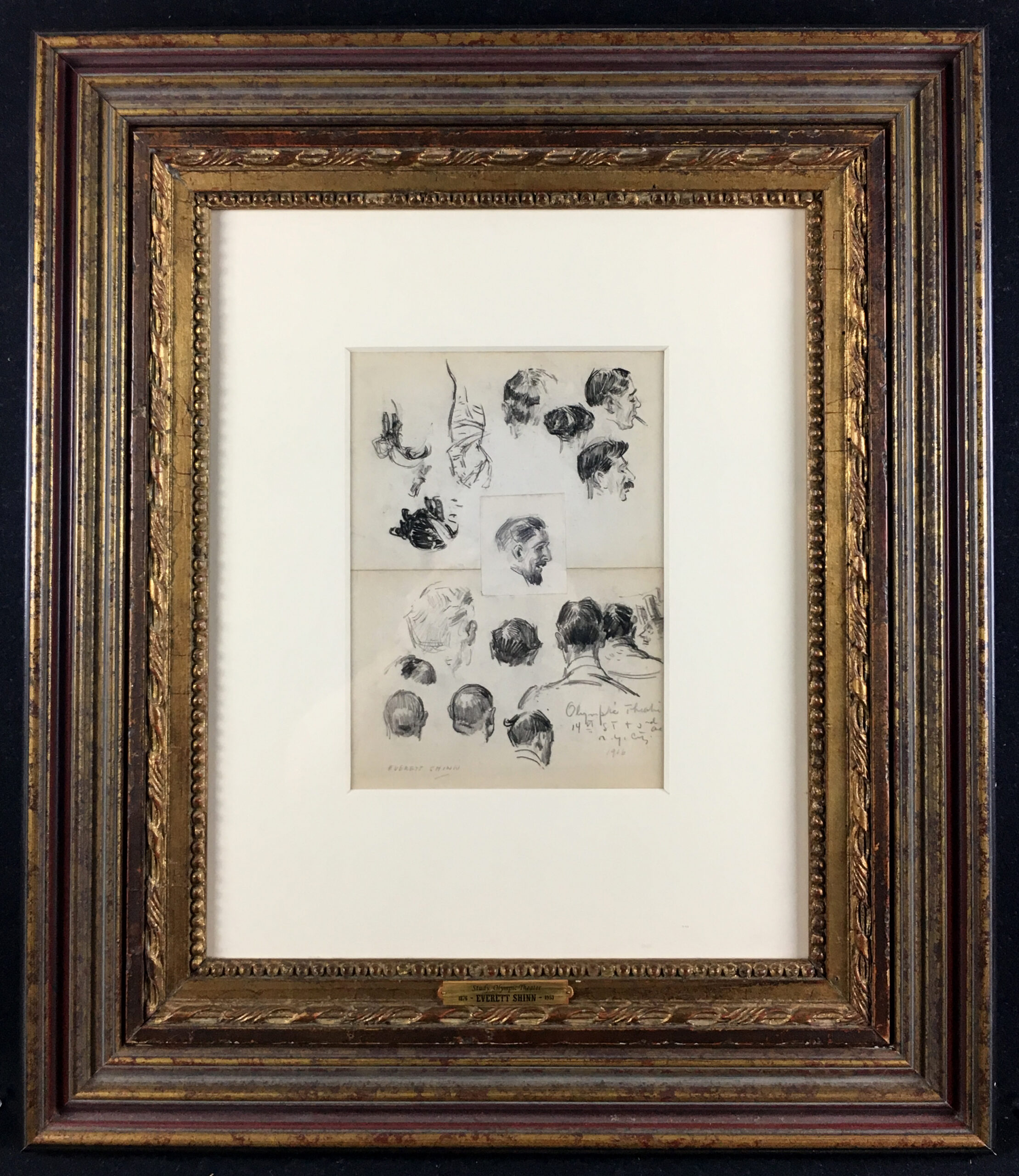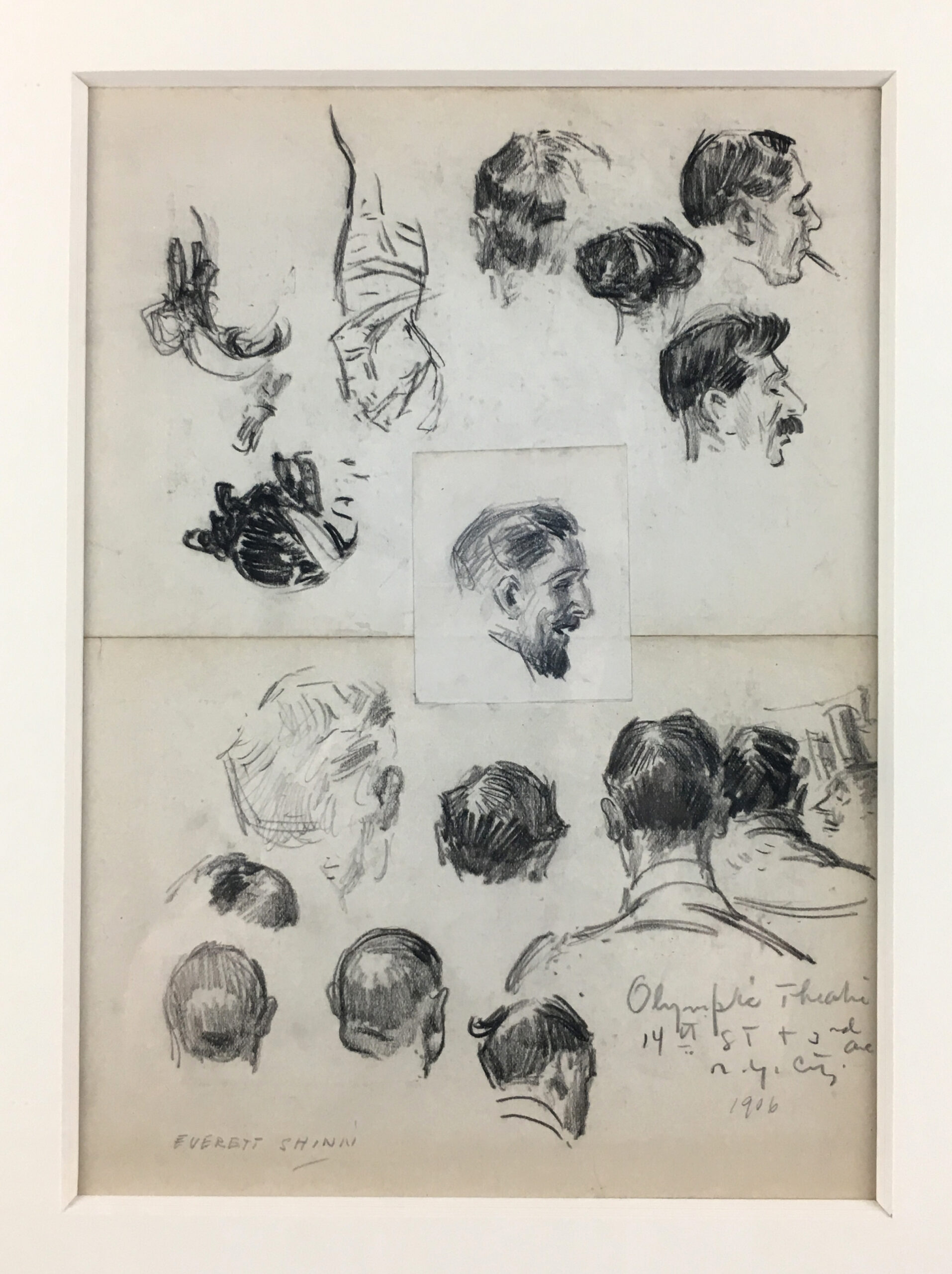 Graphite drawing on wove paper, signed in pencil and annotated “Olympic theater /13th St.& 3rd Ave / N.Y. City / 1906”, executed on three sheets of on cream wove paper laid down onto thin paper board.