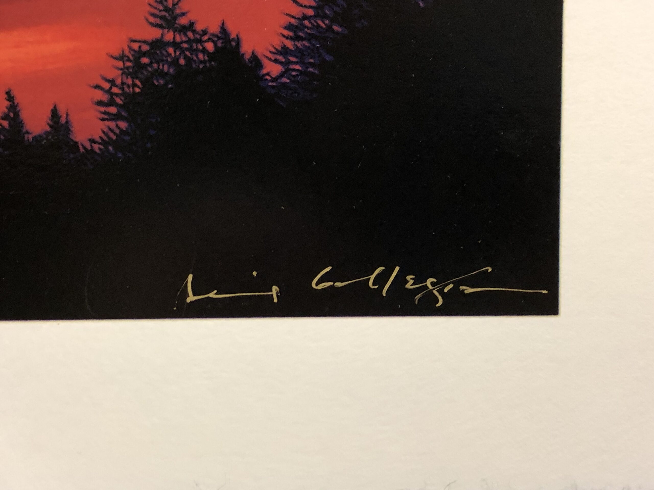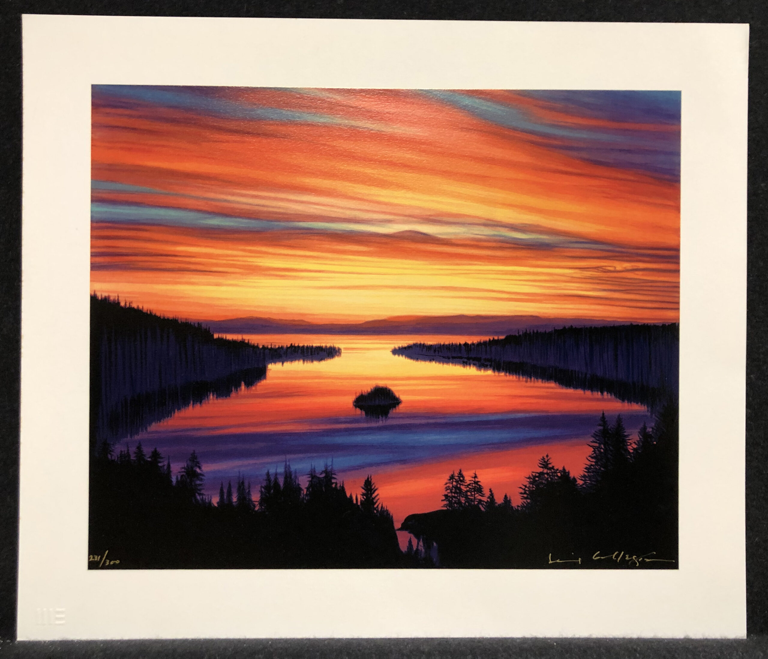 Screen print, a.k.a. serigraph, signed in gold ink in the image at lower right and annotated “231/300” at left, printed on heavy, stiff, fine-grained, white wove paper. Printed at the Hue Art Studio, Gardena, CA, 1992, with their embossed chop at lower left corner. Mint condition. Free shipping to US address.
