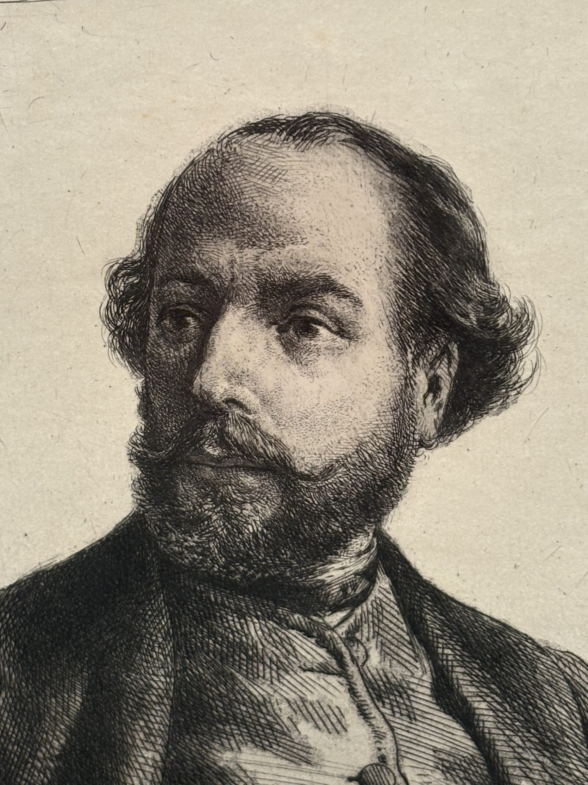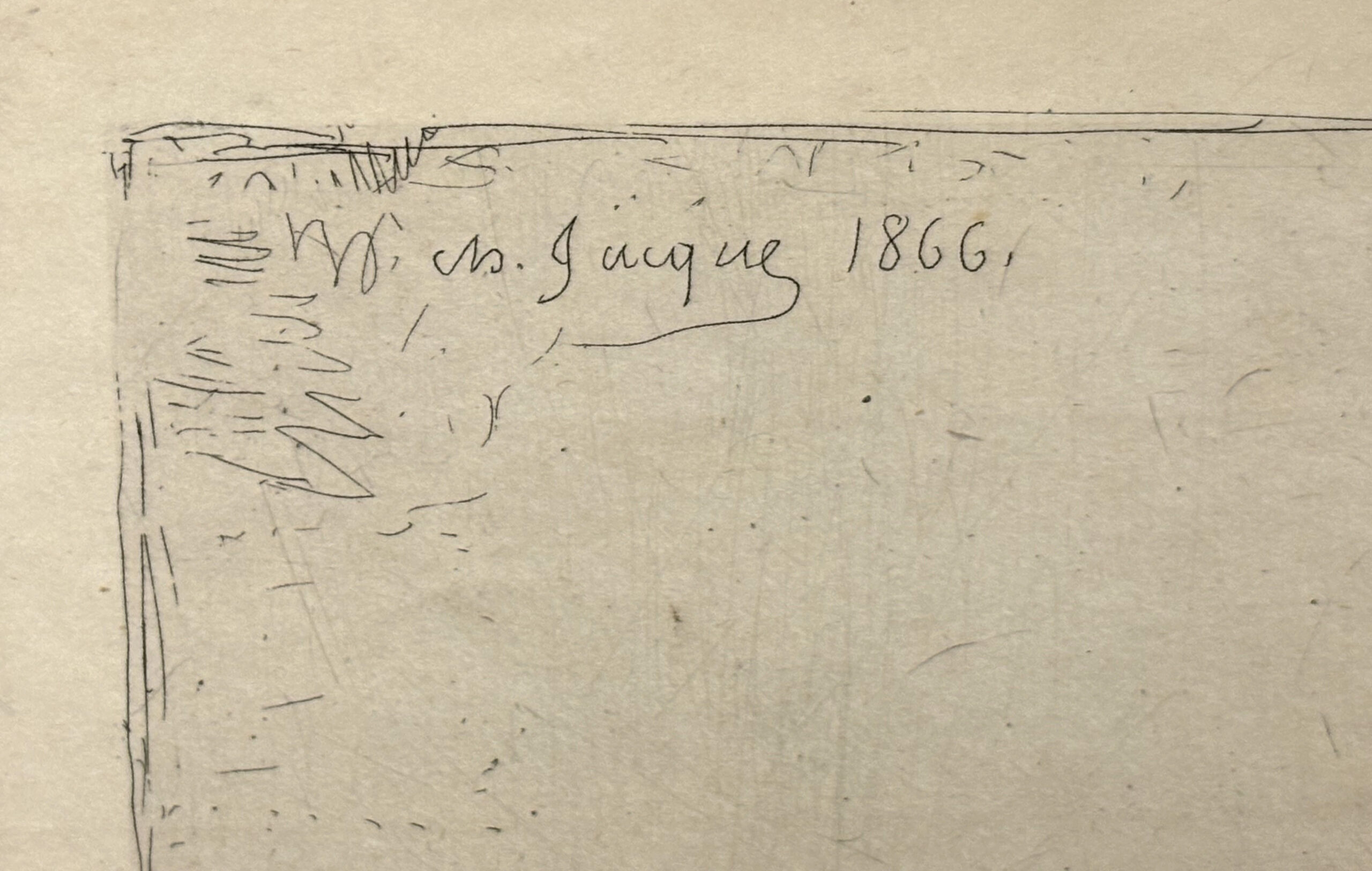 Fleeing the Cholera epidemics that besieged Paris in the mid-nineteenth century, Charles Jacque relocated to Barbizon in 1849 with Millet. There, he painted rustic or pastoral subject matter: shepherds, flocks of sheep, pigs, and scenes of farm life. In addition to painting, Jacque was also famous for his etchings and engravings. He, along with Félix Bracquemond and Felix Buhot, is credited with the nineteenth-century revival of seventeenth-century techniques. He began his career as an engraver around 1841 by publishing a series of etchings with Louis Marvy. He followed this work with a series of engravings based on the works of Adriaen van Ostade, after which he began to create original engravings / artworks. Charles Baudelaire said of him, "Mr. Jacque’s new reputation will continue to grow always, we hope. His etchings are very bold and his subject matter is well conceived. All that Mr. Jacque does on copper is filled with a freedom and a frankness which reminds one of the Old Masters."