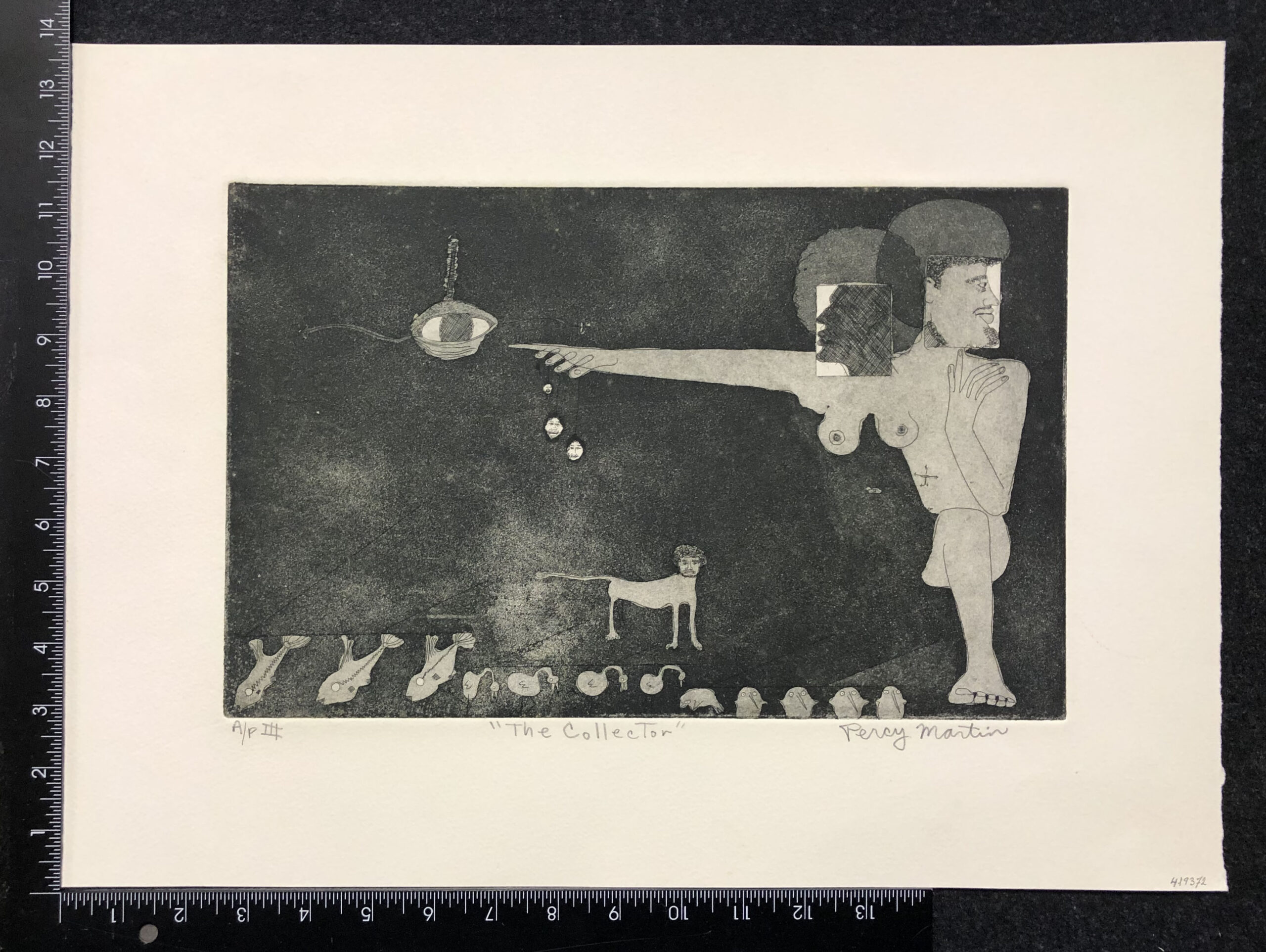 NotesPercy Martin is an African-American artist based in Washington, DC. He has created a vast personal mythology of interrelated characters that are depicted in his prints and drawings. The mythology, which informs much of his work, "comes from reading and listening to people telling me that we as a group, as Black Americans, has never done anything. They also attack where we came from." Martin did research on mythology and found that many myths are universal, ". . . and a lot of the stories could be traced back to Africa. But when I started using myth so many people would say to me, 'No, no, no! You didn't get this just right – this little part, you didn't get it right.' So I decided to create my own mythology – a personal mythology."