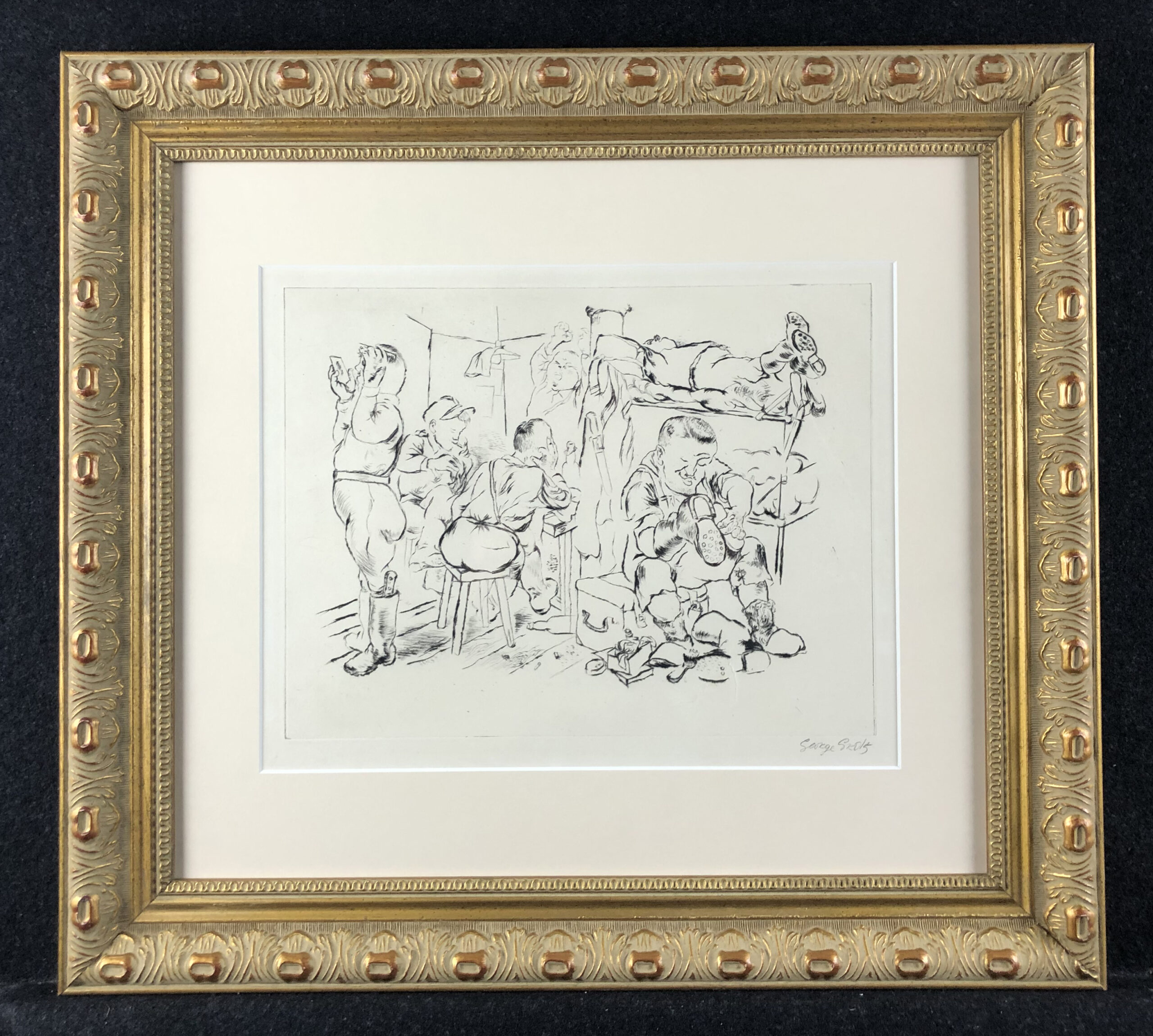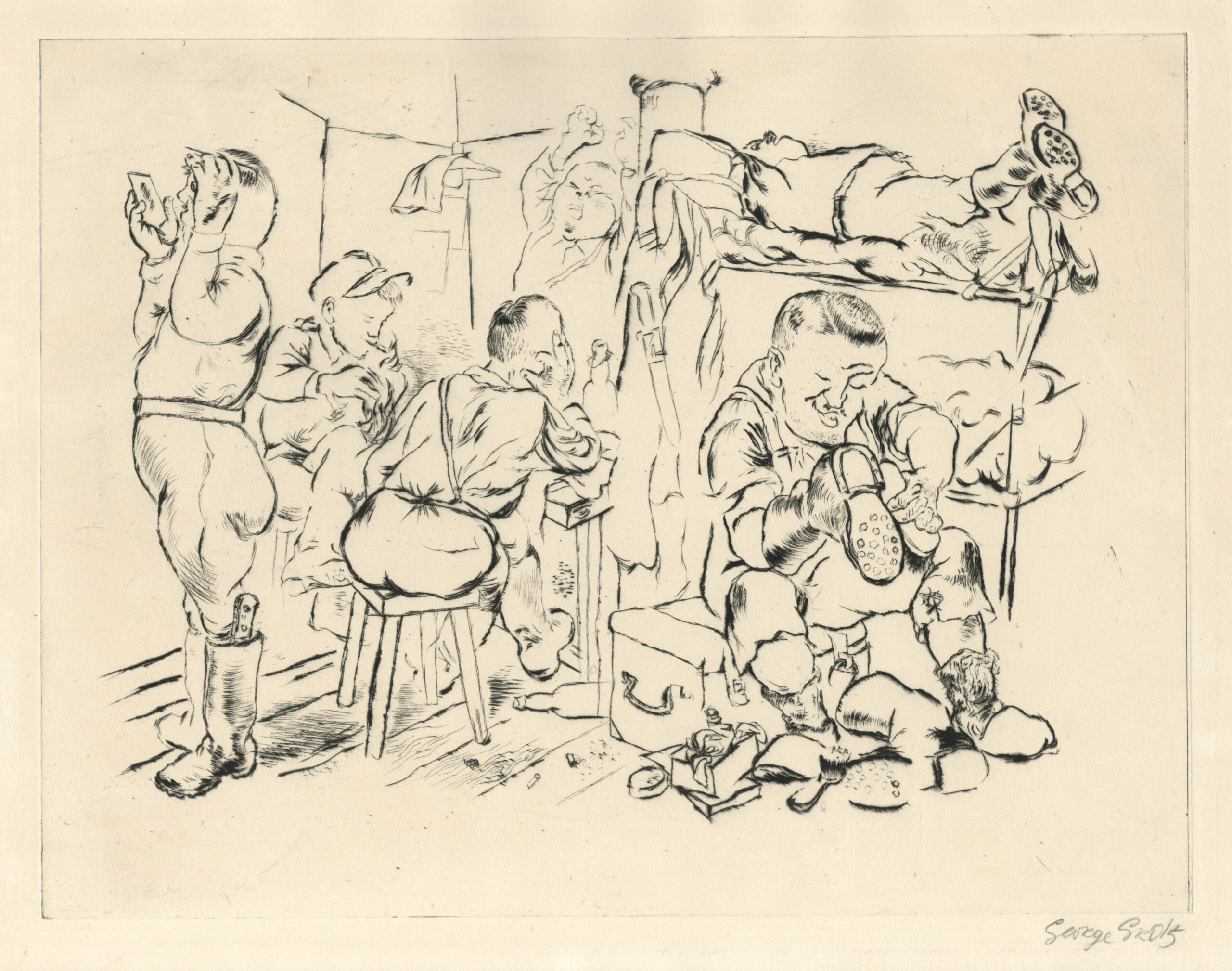 NotesGeorge Grosz (July 26, 1893 – July 6, 1959) was a German artist known especially for his caricature drawings and paintings of Berlin life in the 1920s. He was a prominent member of the Berlin Dada and New Objectivity group during the Weimar Republic. He emigrated to the United States in 1933, and became a naturalized citizen in 1938. Abandoning the style and subject matter of his earlier work, he exhibited regularly and taught for many years at the Art Students League of New York. In 1956 he returned to Berlin where he died.