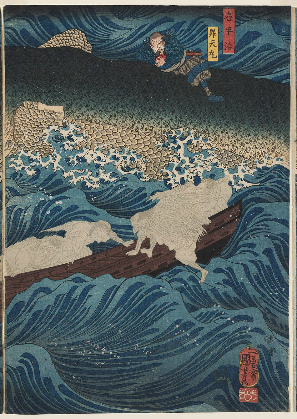 NotesKuniyoshi was born on 1 January 1798, the son of a silk-dyer, Yanagiya Kichiyemon, originally named Yoshisaburō. Apparently he assisted his father's business as a pattern designer, and some have suggested that this experience influenced his rich use of color and textile patterns in prints. It is said that Kuniyoshi was impressed, at an early age of seven or eight, by ukiyo-e warrior prints, and by pictures of artisans and commoners (as depicted in craftsmen manuals), and it is possible these influenced his own later prints.