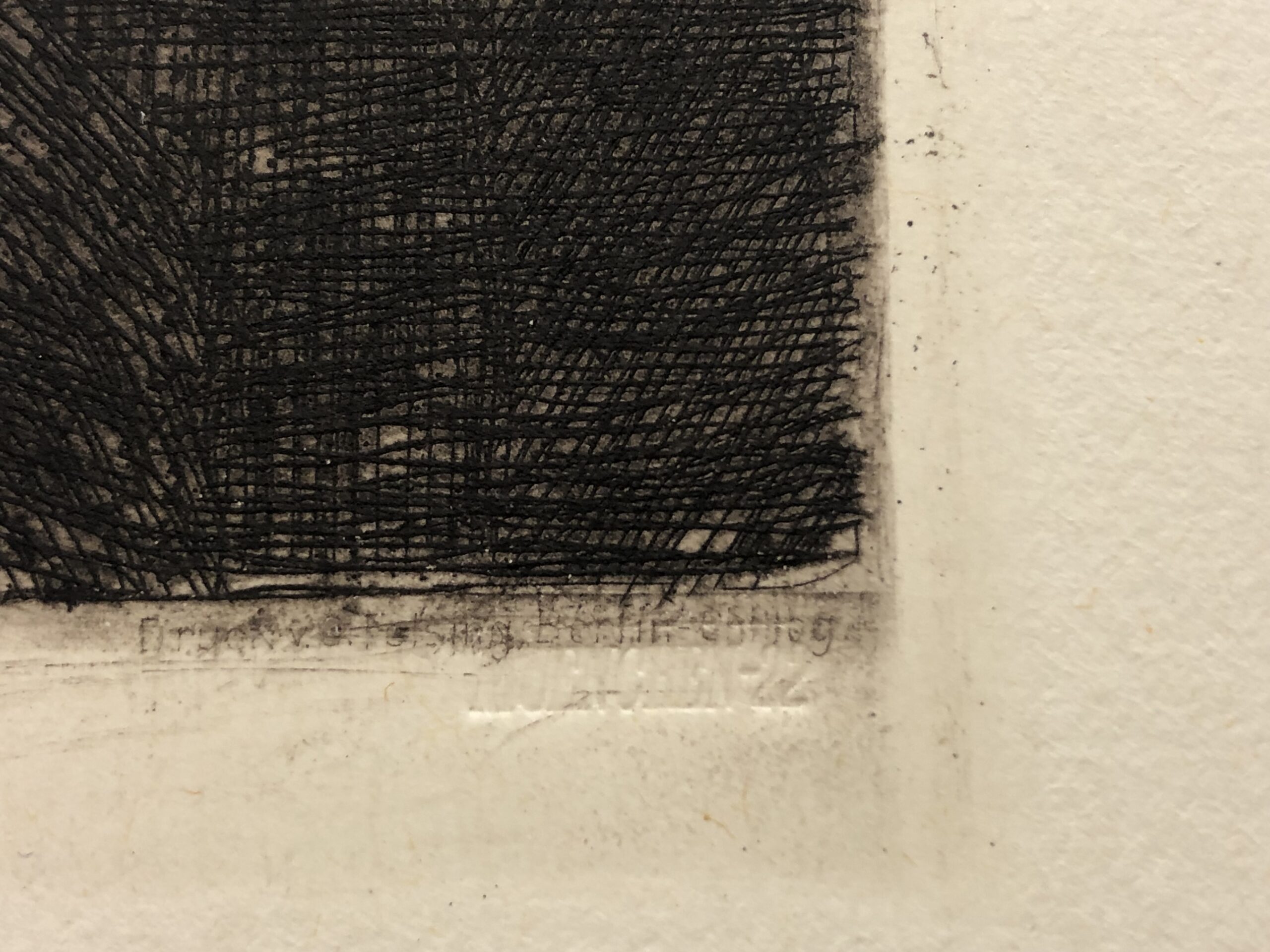 Original etching, unsigned, printed on heavy, felt-finish, cream wove paper. Published by Auguste von der Becke between 1946 and 1961, with the 2-line Muenchen 22 blindstamp in the lower right corner of the image.
