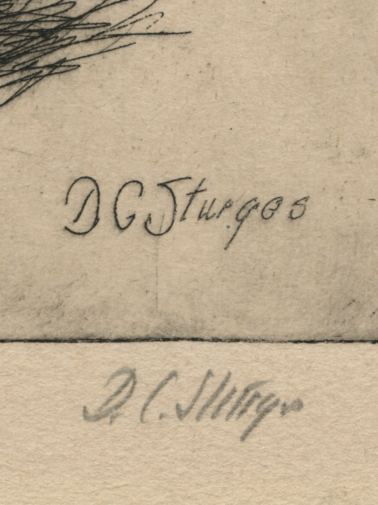 During the 1920's era, D. C. Sturges gained a strong international reputation for both his figure studies and landscapes. During this decade his original etchings were published by the influential Kennedy Galleries, Fifth Avenue, New York. All were published in editions of 100 or less. Dwight Sturges's fine etchings were thus exhibited frequently in both England and France. (source: Art of the Print)