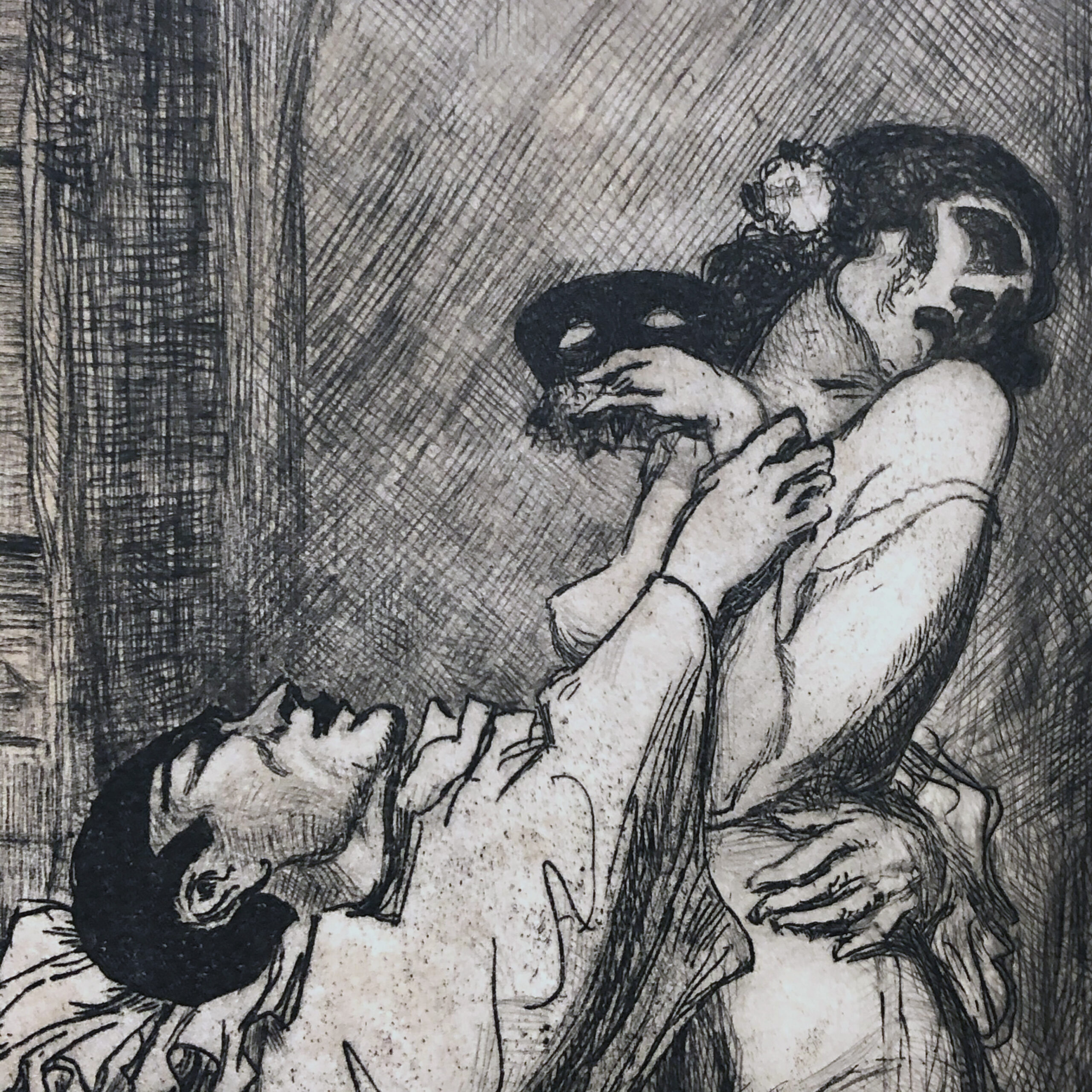 Drypoint, state 2 of 2, signed in pencil on trimmed tab (Whistler style), printed in black ink on heavy, cream wove paper, thread margins. A very rare final state with the filled-in background and heavily reworked clothing. Very good condition, large surface stain on verso, not penetrating to front. Free shipping to US address.