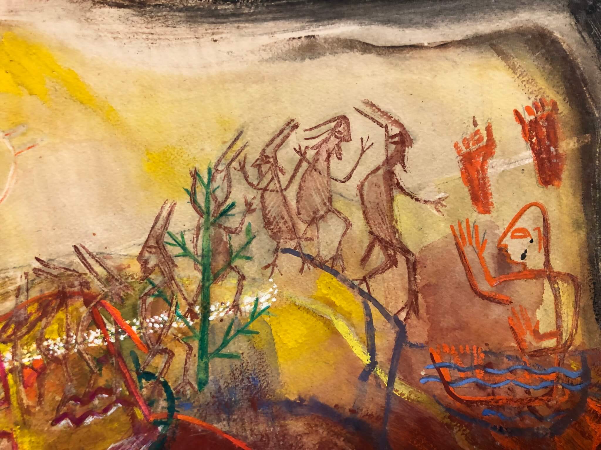 Shortly after her arrival, a friend introduced Sims to the Galisteo Basin south of Santa Fe which was dotted with the ruins of prehistoric Indian Pueblos, and home to tens of thousands of ancient petroglyphs. The rock art captivated Sims and became her primary inspiration for the rest of her career. Over the next decade she recorded 3000 petroglyphs in drawings and thousands more in photographs. In 1949 she received a grant from the American Philosophical Society to further her research, and in 1950 she published a portfolio of selected rock at drawings in her monograph, San Cristobal Petroglyphs. Most of Sims paintings and sculptures were inspired by petroglyphs, but unlike her documentary drawings they never were literal copies. Rather she adopted and adapted the two-dimensional representations of people and animal into an art that fit comfortably into the larger world of mid-century modernism. She used simple, idiosyncratic figures to create her own symbolism, the original meanings of the ancient art being mostly lost to the past.