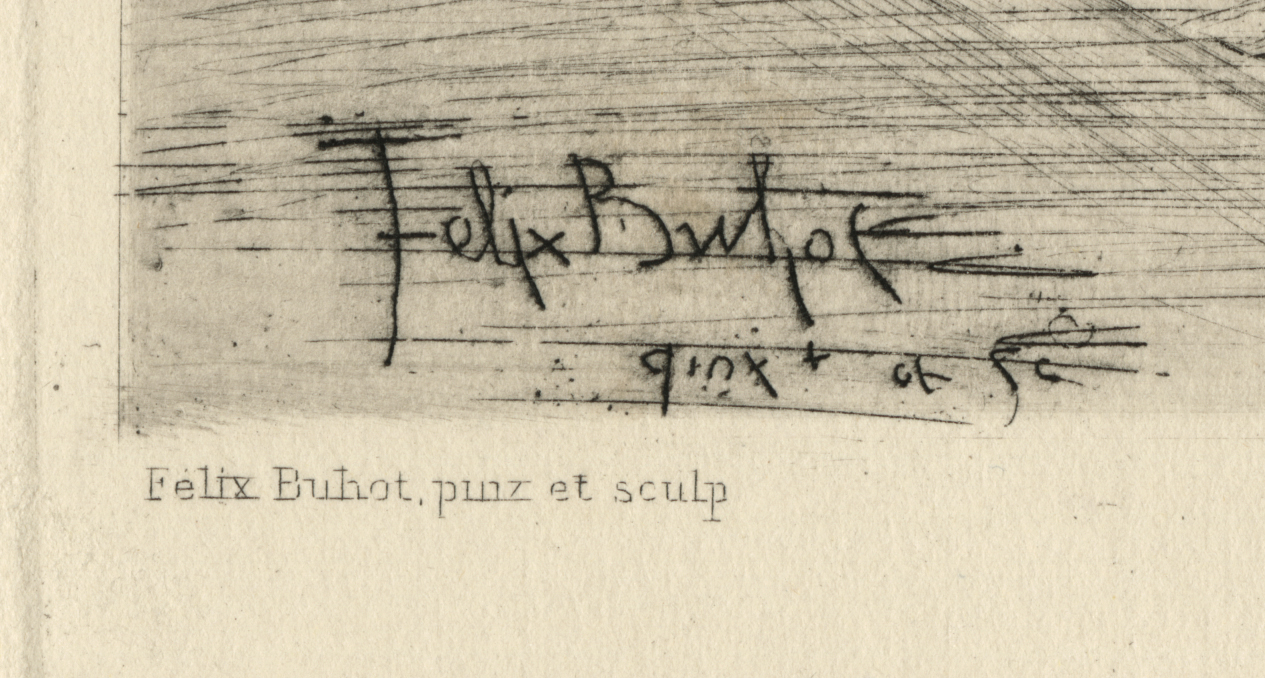 NotesFélix Hilaire Buhot was a French painter and illustrator. Among the most original prints made in France during the last quarter of the nineteenth century are those by Félix Buhot. Along with artists like Charles Jacque, Louis Monziès and Félix Bracquemond, he is credited with reviving seventeenth-century etching techniques in late nineteenth-century art. However, he was highly experimental and regularly employed technical variables and regularly combined multiple processes to produce a single print. He used traditional techniques of etching, drypoint, and aquatint along with modern methods such as photomechanical reproduction. Buhot’s most notable contribution to the history of printmaking is a device he termed "marges symphoniques" (symphonic margins). Inspired by the marginal decorations of medieval manuscripts and eighteenth-century French book illustrations, Buhot developed two types of margins, etching the first on the same plate as the central subject and printing the second, called a “false margin,” from a separate plate.