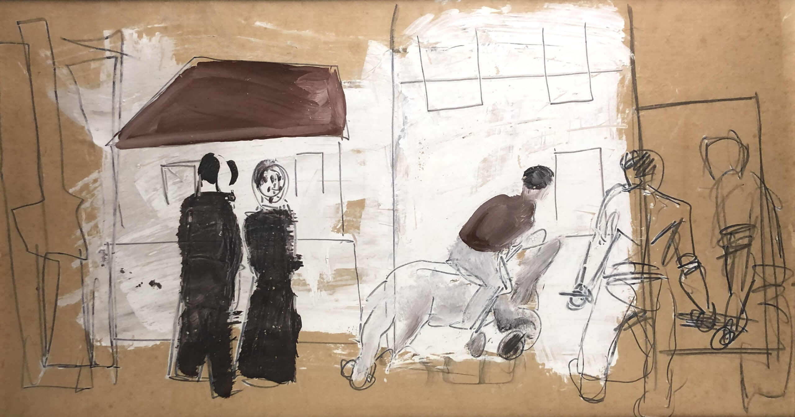 He saw Expressionist works during visits to Germany between 1908 and 1911 but mainly stayed in Rome from 1909 to 1914. By 1913, Balla, Boccioni and Severini had developed a new style—Futurism—which Sironi also adopted for a brief time, although his work showed little of the characteristic Futurist exaltation of speed and modernity. In 1914 he exhibited with the Futurists at the Galleria Sprovieri in Rome. Works from this period include several abstract tempera paintings entitled Composizione futurista (1915), a series of paintings of airplanes in tempera or tempera with collage, and several paintings of lone cyclists or motorcyclists.