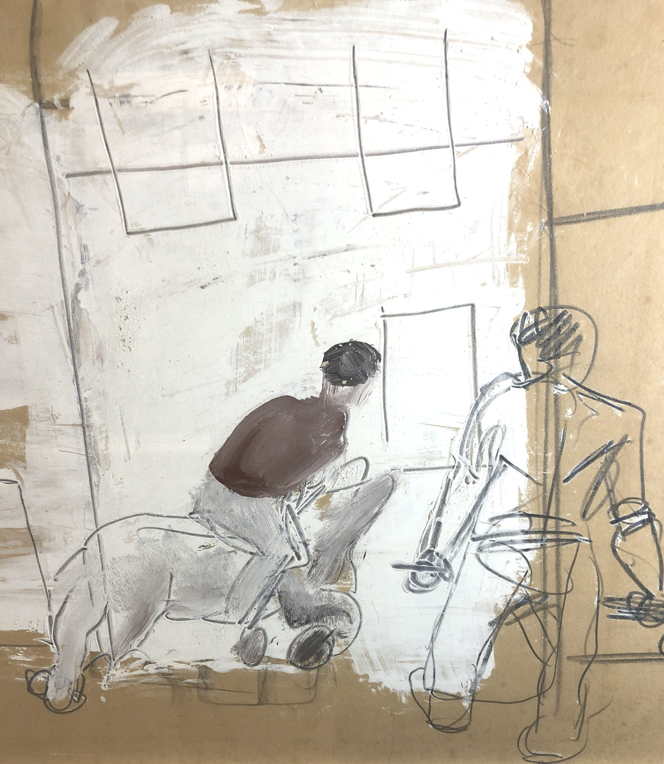 In the late 1920s, Sironi painted monumental figures of nudes, peasants, and family groupings in bare, mountainous landscapes. In these works—described by Fabio Benzi as "marked by a sense of humanity burdened with history ... [and] an almost Romanesque spirit of a solemn expressionism"—the pure forms of Sironi's earlier work were replaced by a primitivist form of classicism, and his style became more painterly. In paintings of fishermen at work or drinkers in cafés, he adopted a deliberately ungainly style similar to that of Georges Rouault.