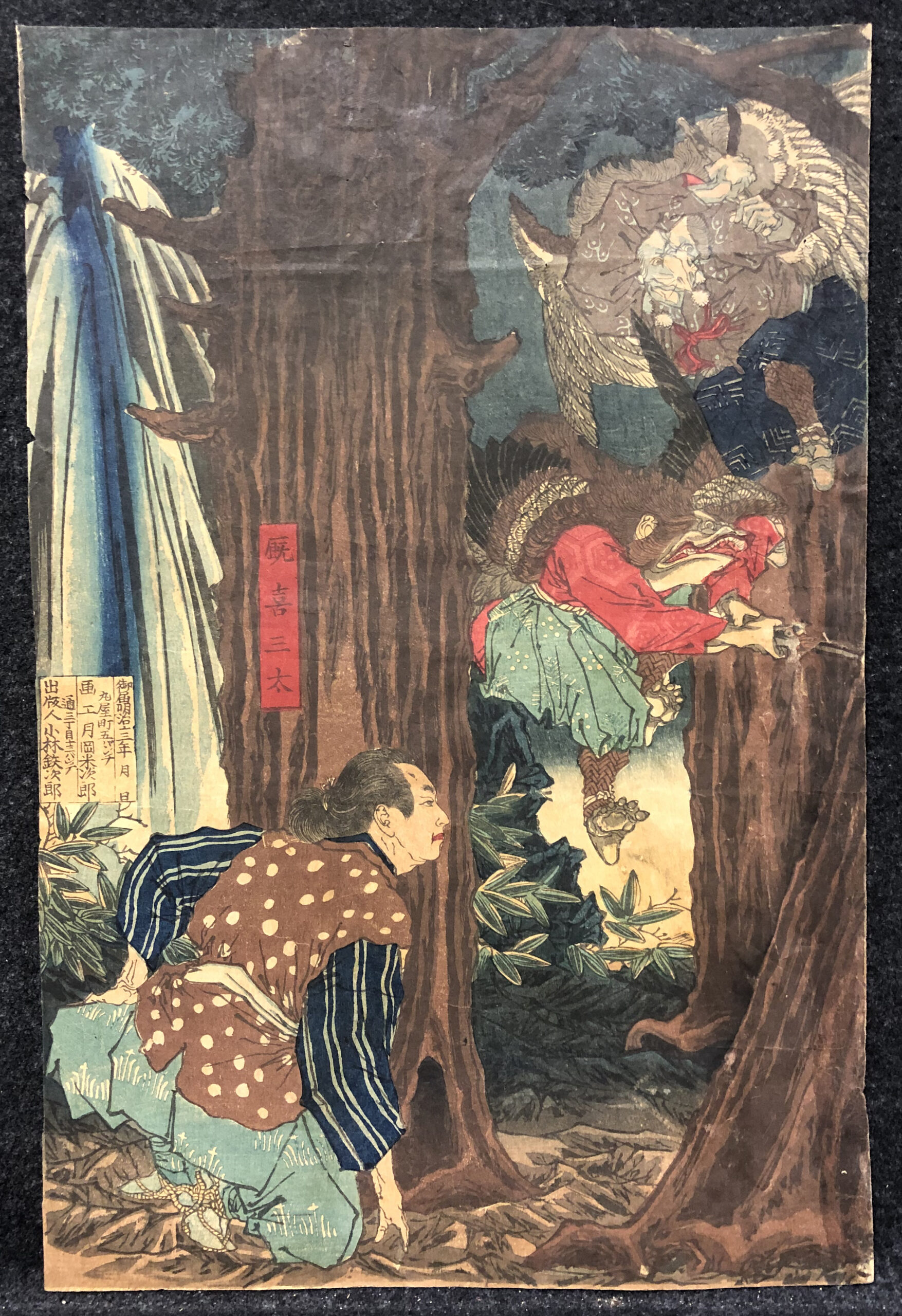 Polychrome woodblock print, vertical oban triptych, printed on Japan kozo paper, published by Kobayashi Tetsujirō, 1880.