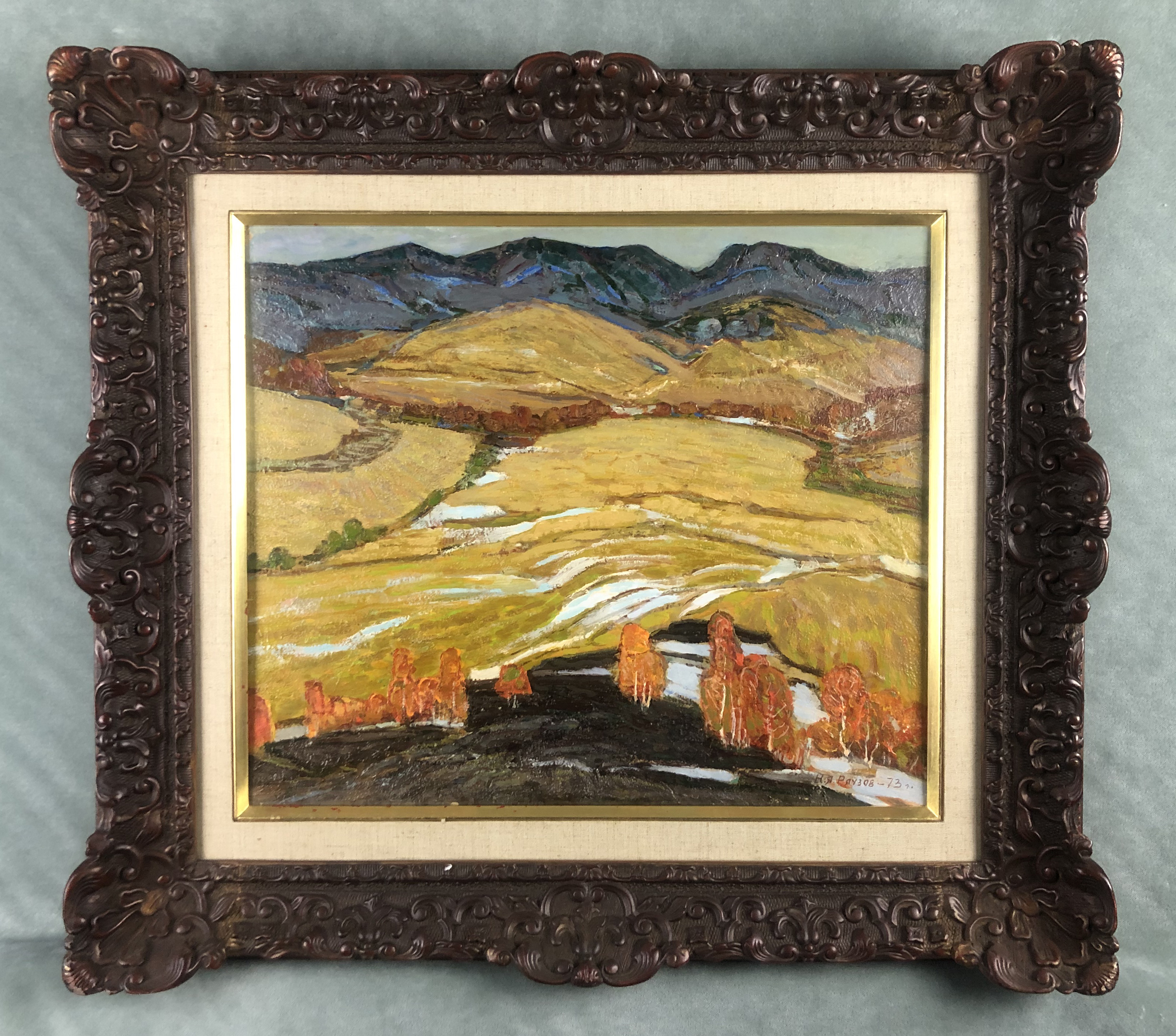 Oil on canvas, signed (in Cyrillic) and dated “73” lower right.