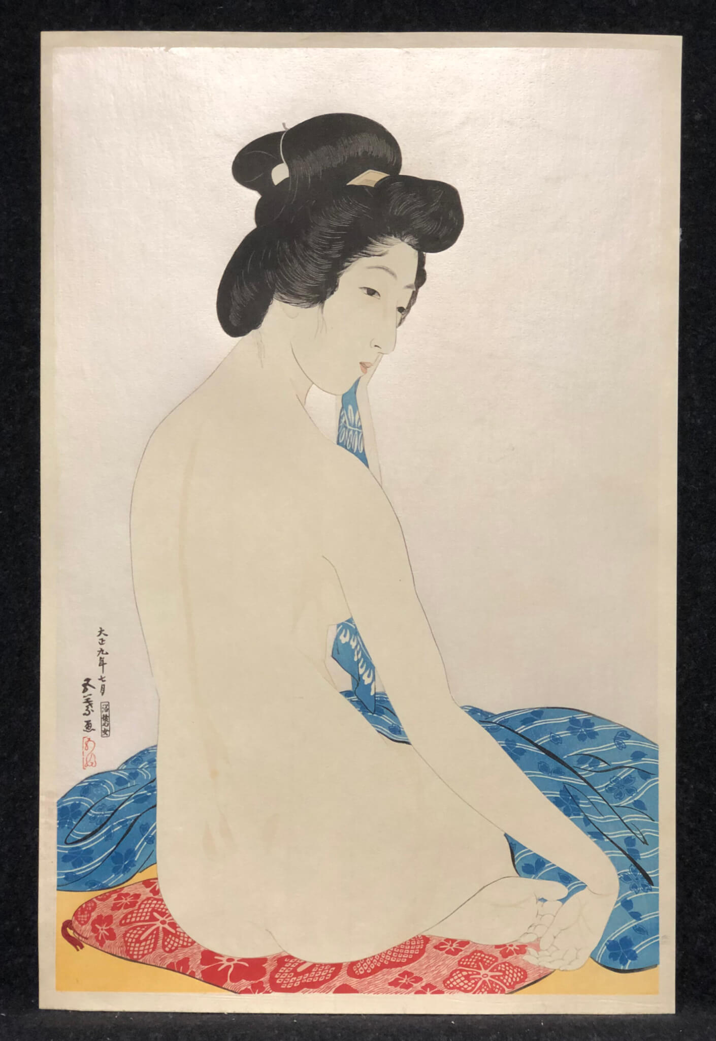 Notesapanese artist Goyo Hashiguchi (né Kiyoshi Hashiguchi) was born in Kagoshima to Kanemitsu Hashiguchi, a samurai and a Shijo-style painter. It is said that the five-needle pine (goyo no matsu) in his father’s garden inspired Goyo’s artist name. He began his career in Kano painting at age 10, moving to Tokyo in 1899 to study with the leading Kano painter Gaho Hashimoto. He soon shifted to Western-style painting under Seiki Kuroda at the Tokyo School of Fine Arts, graduating at the top of his class in 1905. Shortly thereafter, the prominent Tokyo woodblock print publisher Watanabe convinced him to become a Japanese woodblock artist. Watanabe published Goyo’s first woodblock print, Nude After Bathing in 1915. His sensitive portrayal of women in a delicate, serene and infinitely graceful mode led to his immediate popularity. This mastery of line and composition is equally apparent in his tender drawings. These drawings are extremely scarce.