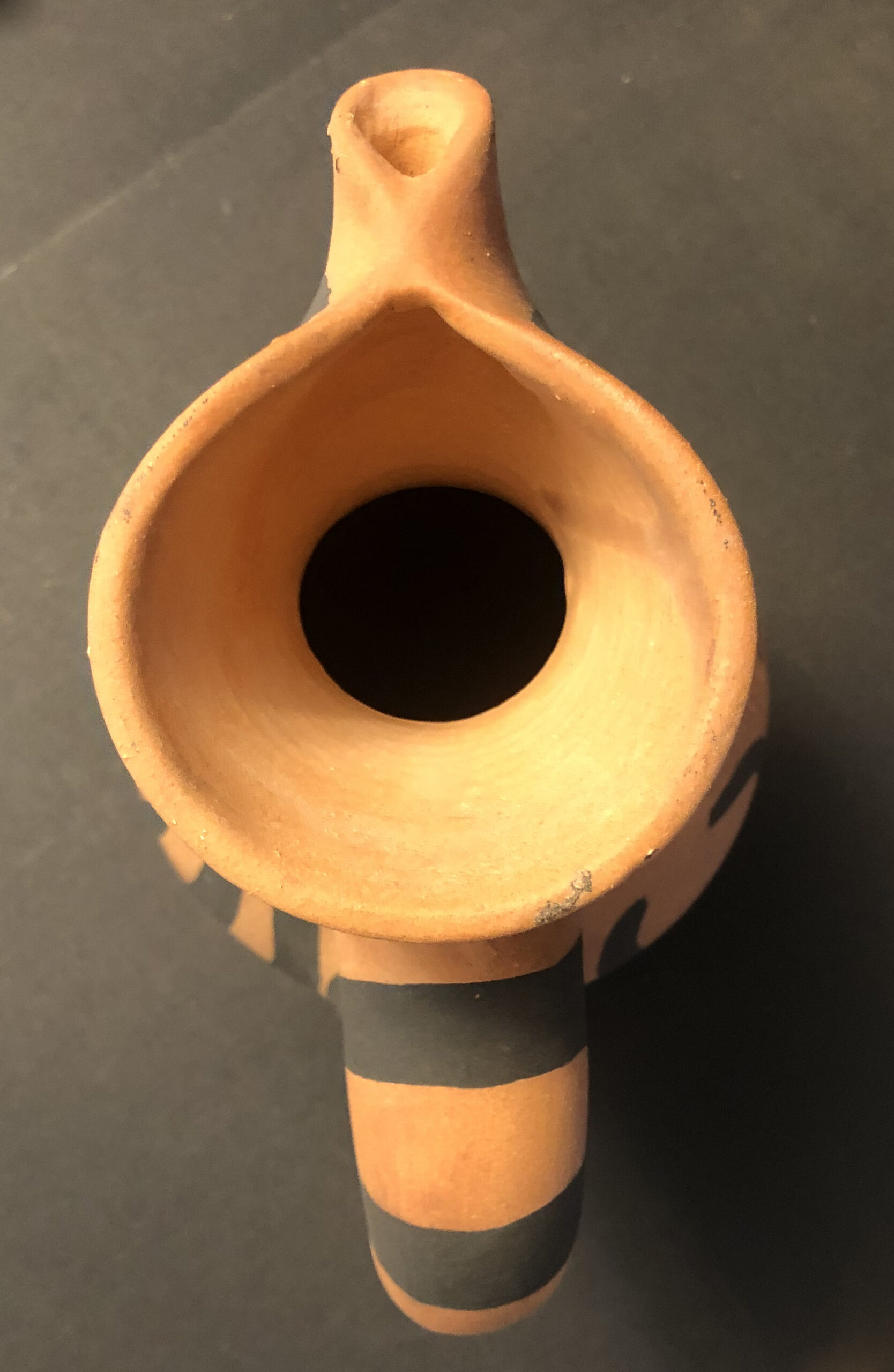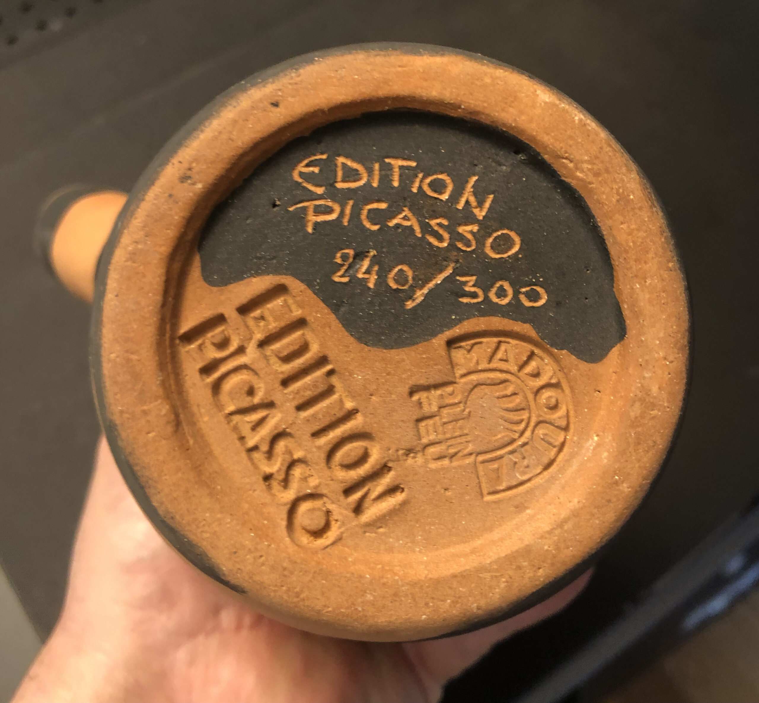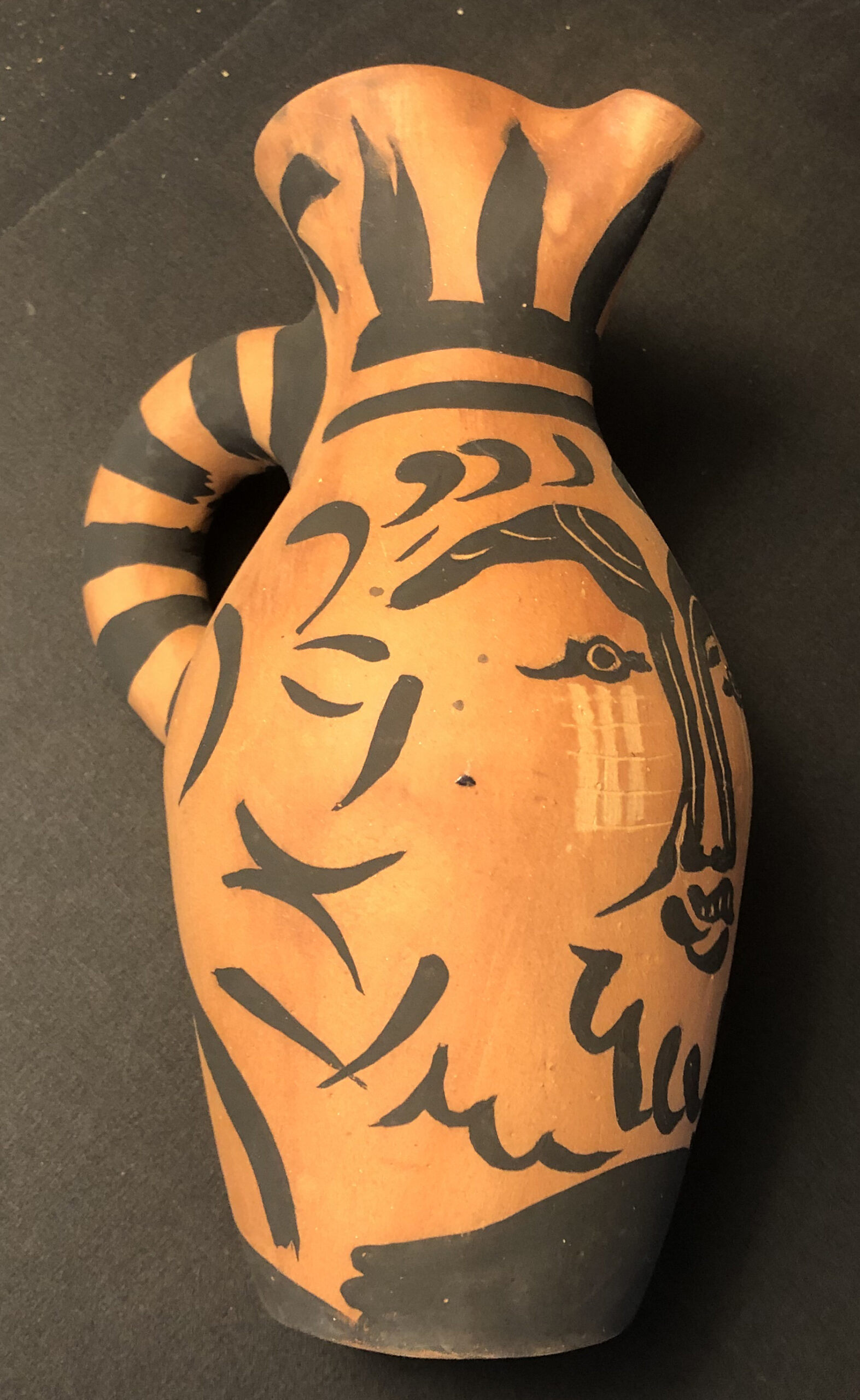 Earthenware decanter with black decorations and knife engraving, signed “Picasso Edions” at bottom with the Madoura stamps.